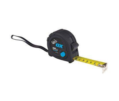 OX Trade Tape Measure 5m/8m with a nylon coated steel blade and duragrip moulded rubber case. This tape measure has an easy access sliding thumb lock and shock absorbing blade with quick release bottom strip.